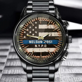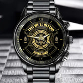 Ehrendienst mit Eleganz – die personalisierte Veteranen-/Soldat-Edelstahluhr ist ein Beweis für Tapferkeit. Dieser langlebige Zeitmesser mit individuell graviertem Namen, Dienstgrad und Dienstjahren feiert mit seinem tiefschwarzen Zifferblatt und dem goldenen Sterndetail die Reise jedes Soldaten.