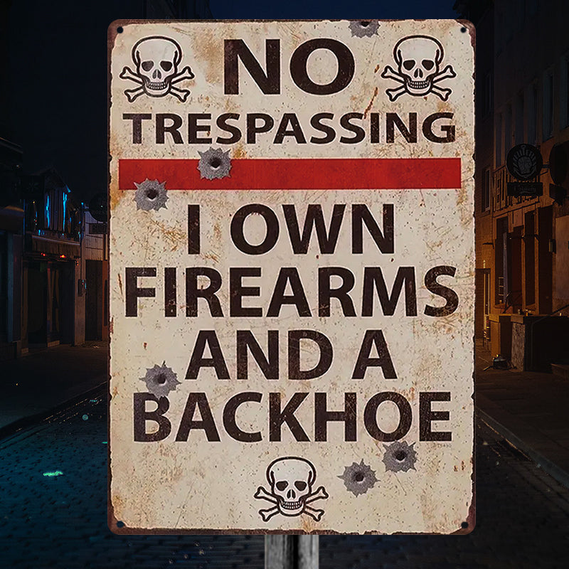 Kein Betreten, ich besitze Schusswaffen und ein Bagger-Privateigentum – personalisiertes, individuelles Metallschild