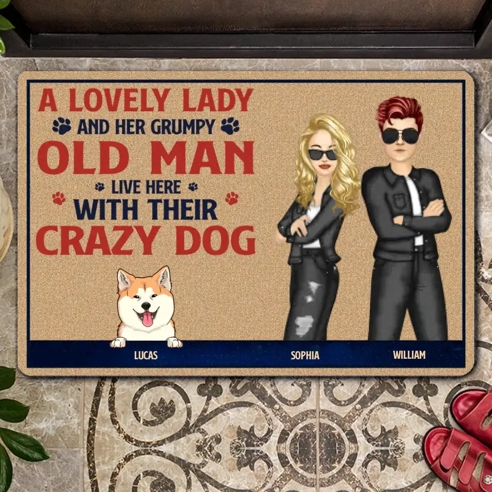 Personalisierte Fußmatte „Eine hübsche Dame und ihr mürrischer alter Mann leben hier mit ihrem verrückten Hundepaar, Hundeliebhaber“.