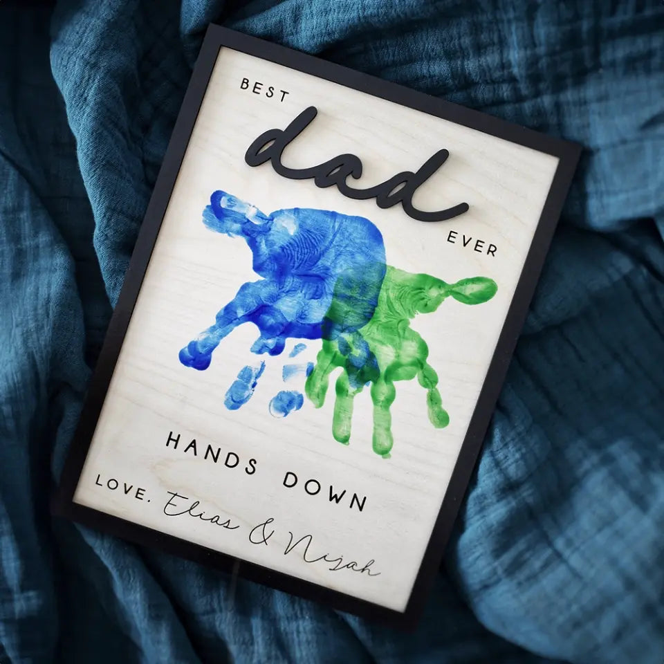 Celebrate Father's Day with a unique, handcrafted wooden sign engraved with "Best Dad Ever." This customizable piece becomes a cherished keepsake by incorporating your children's handprints, alongside a playful "hands down" engraving and a heartfelt message from the kids. Perfect for any father figure in your life, this sign is designed to showcase the love and appreciation that defines your special relationship.